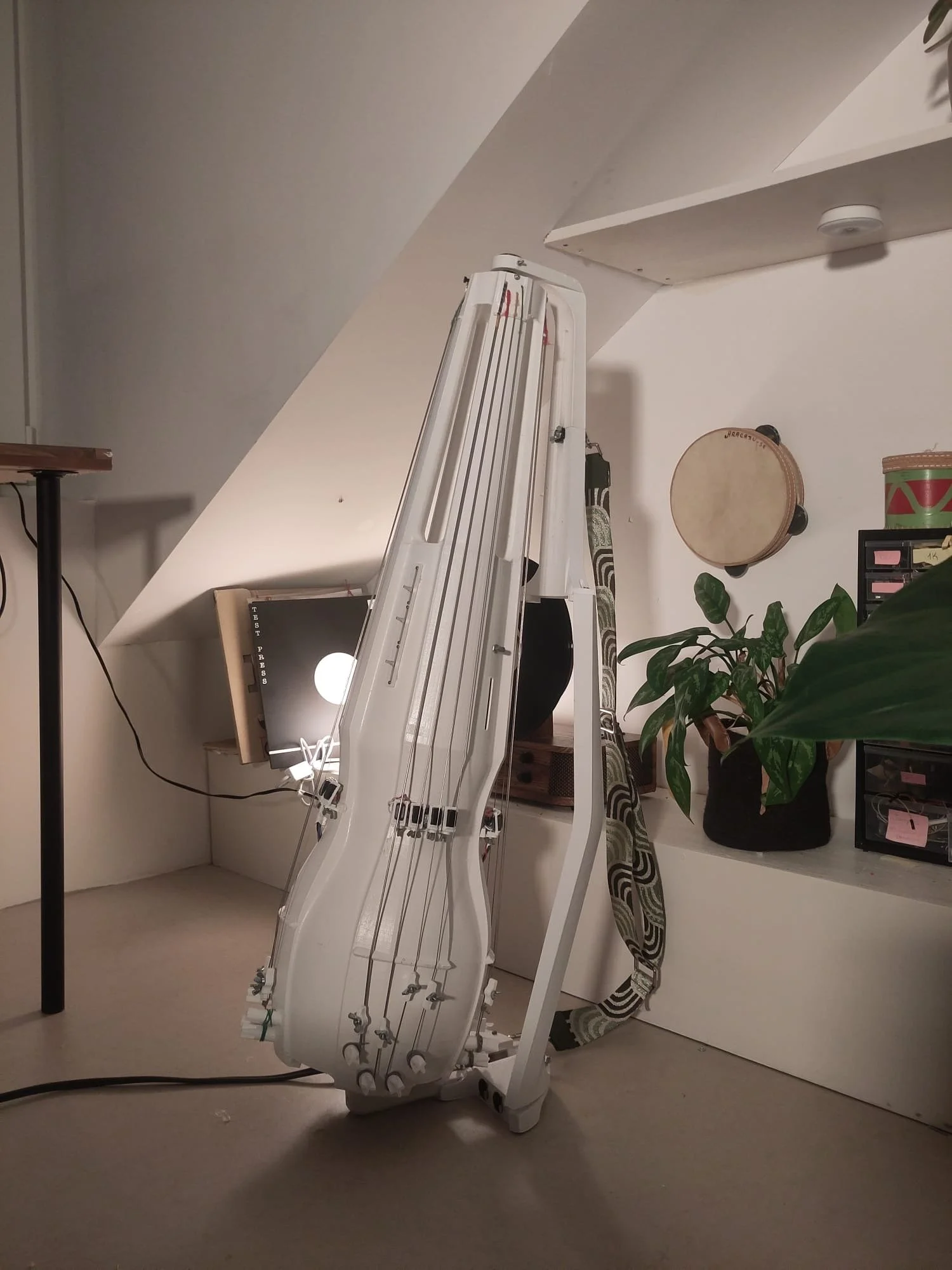 The design parts of the frame can be replaced, shrinked and dismounted easily, ideal to prepare this instrument for long trips. The sound of the instrument improved significantly, thanks to the pickup system and several researches about the ideal sound of recycled organic light weight PLA.